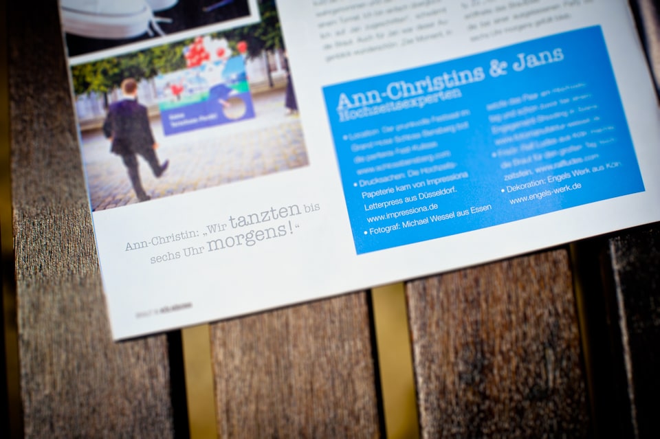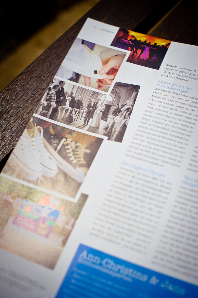 Wie gerne erinnere ich mich an die wunderschöne Traumhochzeit von Ann-Christin & Jan auf Schloss Bensberg wo ich die Ehre hatte die beiden als Hochzeitsfotograf Köln zu begleiten. Natürlich freut es mich auch, dass das Braut & Bräutigam Magazin einen kleinen Bericht über die Beiden und Ihrer Hochzeit im aktuellen Sonderheft für den Bereich Köln und Bonn veröffentlicht hat.